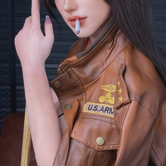 Heidi leans back in a sultry black slit dress, leather jacket falling from one shoulder, dark brunette hair tumbling over H-cup curves that beg your hands to explore; at 168 cm, her full-silicone body glows with realistic body painting, delicate veins, and a fair, natural skin tone that warms to your touch.